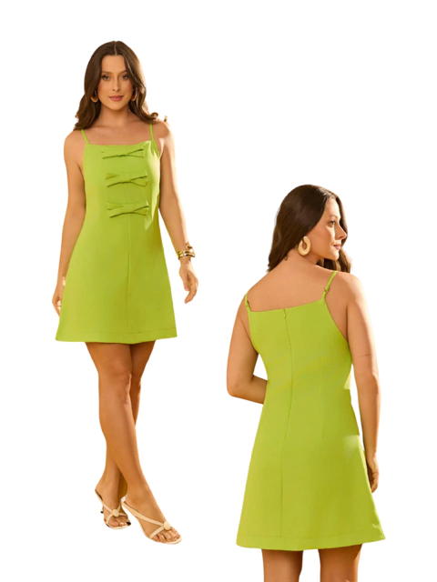 Confeccionado em tecido com 94% poliéster e 4% elastano, proporciona caimento perfeito e conforto. Detalhes delicados em laços que valorizam a peça com charme sutil. Modelo curto e forrado, ideal para eventos que pedem elegância e leveza.